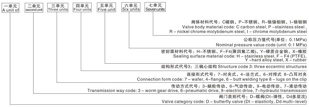 示例:D973F-16C表示三偏心對夾式電動四氟密封蝶閥,公稱壓力1.6MPa,碳鋼閥體,密封面嵌聚四氟乙烯。