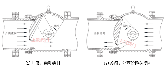 2、 停泵時,閥門同步動作,液控系統(tǒng)蓄能器內(nèi)的壓力油經(jīng)換向閥進入油缸有桿腔,使油缸退回。閥門關(guān)閉分兩級段自動進行,先快關(guān)65°,截斷大部分水流,然后在緩閉缸作用,再慢關(guān)剩下的約25°,泄出部分回流介質(zhì)消除停泵水錘,并防止閥板與閥體的撞擊,最終完全關(guān)閉?炻P(guān)速度和角度均可在油缸后端裝置上調(diào)節(jié)。