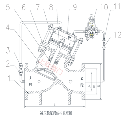 由主閥和導(dǎo)閥組成。主閥和導(dǎo)閥是分開(kāi)的,導(dǎo)閥為控制部份,調(diào)節(jié)導(dǎo)閥彈簧的加載力可以變換主閥出口端壓力,使其達(dá)到調(diào)定壓力值,并利用介質(zhì)自身能量的反饋?zhàn)饔米詣?dòng)保持出口壓力穩(wěn)定在調(diào)定值。