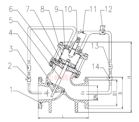 1、閥體2、球閥3、過(guò)濾器4、大閥板 5、閥桿6、缸座7、活塞8、活塞缸 9、缸蓋10、標(biāo)示桿11、球閥12、電磁閥 13、過(guò)濾器14、球閥